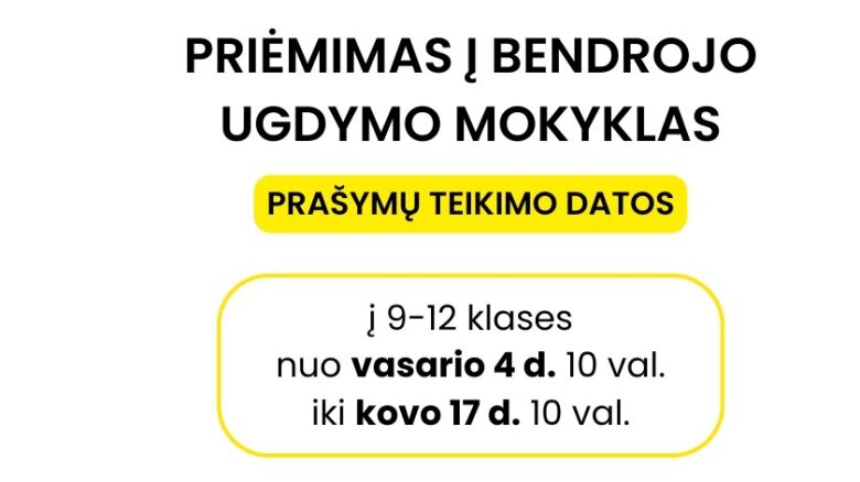 Mokinių priėmimas 2025–2026 mokslo metams - bus vykdomas dviem etapais: pagrindinis ir pavienis. Pagrindinio etapo metu prašymų registracija atskirose klasėse pradedama nuo vasario 10 d. ir tęsis iki kovo 24 d. (10 val.). Pasibaigus pagrindiniam priėmimui (vėliausiai gegužės 20 d.), bus vykdomas pavienis priėmimas į likusias laisvas vietas.
