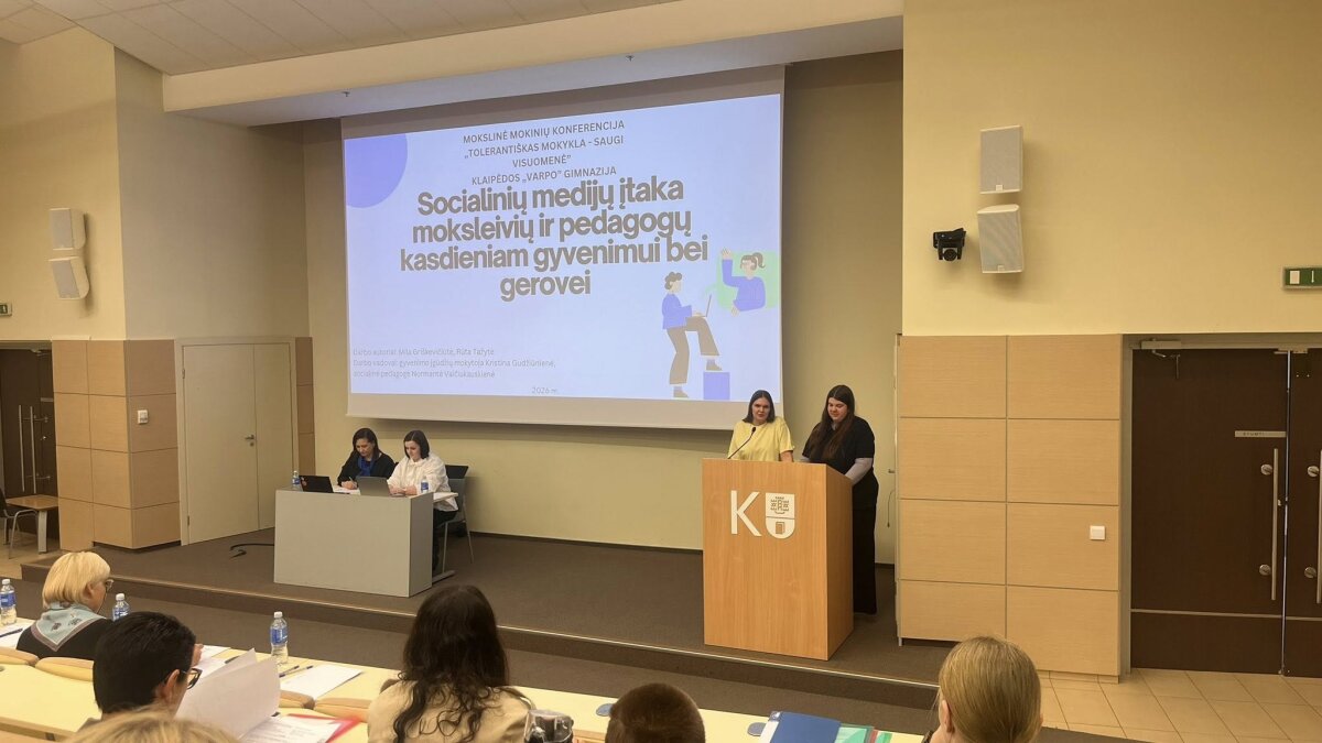Klaipėdos universitete balandžio 17 d. vykusioje konferencijoje „Tolerantiška mokykla – saugi visuomenė“ Varpo gimnazistės pristatė savo atliktus tyrimus apie socialinių medijų poveikį kasdieniam gyvenimui, gerovei ir vertybėms.