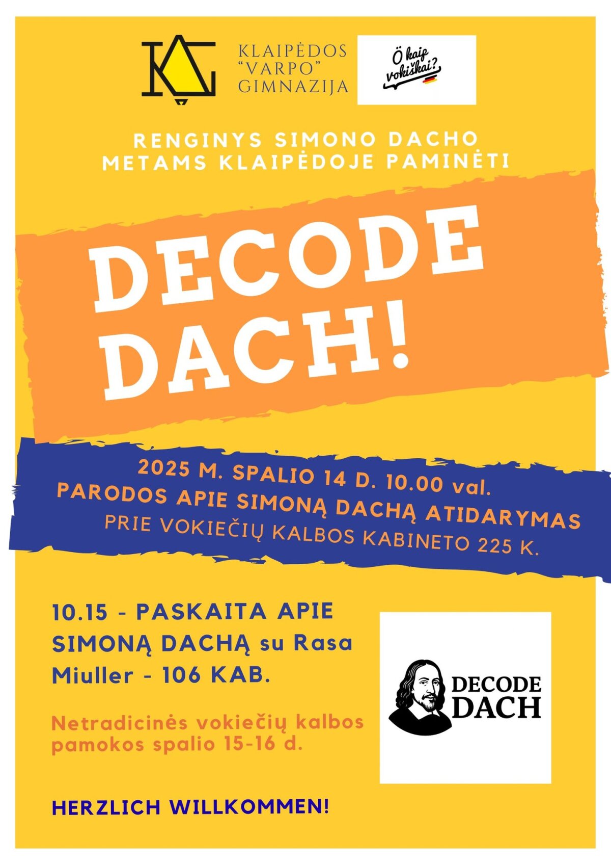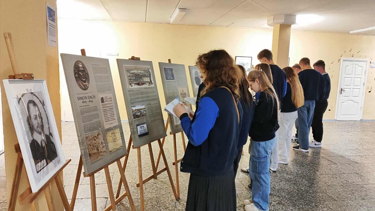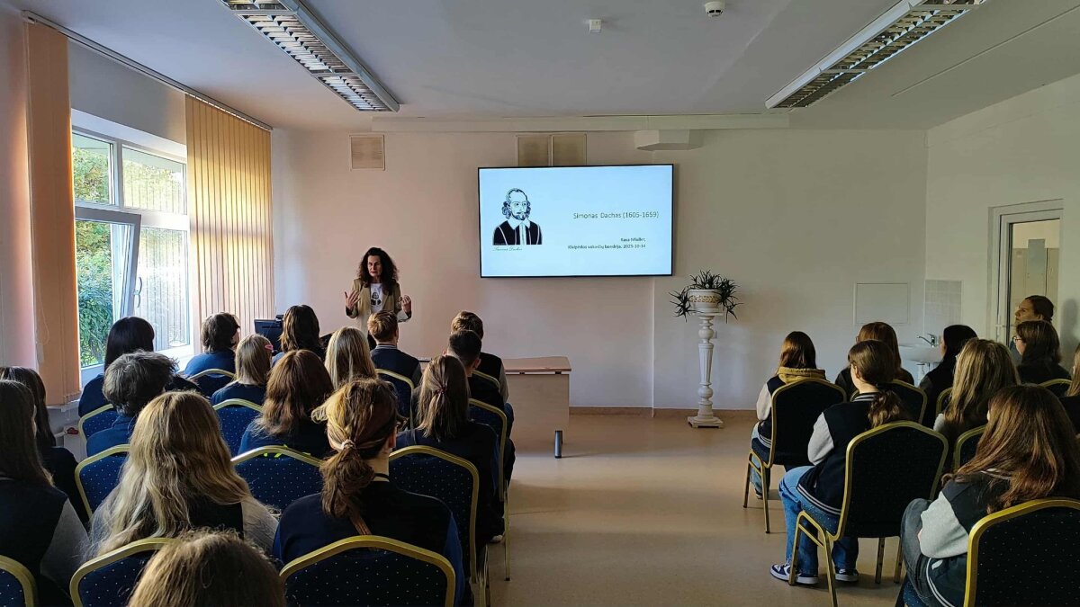 Kadangi šie metai Klaipėdoje paskelbti Simono Dacho metais, atidarymo renginys buvo skirtas šiai asmenybei. Parodą apie Simoną Dachą mūsų gimnazijoje surengė Klaipėdos vokiečių bendrija, kurios kultūros projektų vadovė Rasa Miuller mielai sutiko supažindinti mus su poeto gyvenimu, kūryba ir veiklos palikimu.