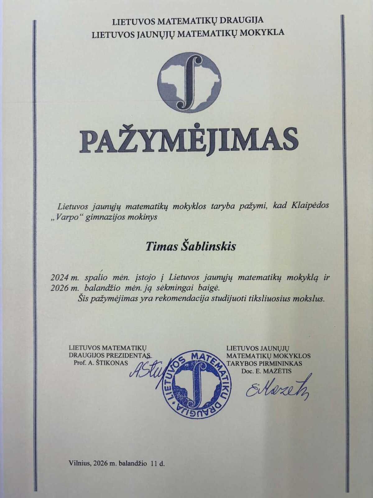 Timas Šablinskis baigė Vilniaus universiteto Jaunųjų matematikų mokyklą
